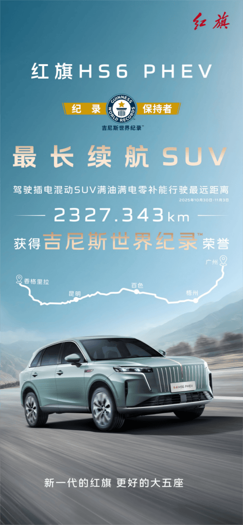 续航焦虑是家庭长途出行的最大痛点,而红旗HS6前不久刚用一场壮举给出了完美答案——在吉尼斯官方见证下,它以满油满电状态行驶2327.343公里,成功创造“驾驶插电混动SUV,满油、满电、零补能,行驶最远距离”吉尼斯世界纪录。这场从香格里拉到广州的征程,途经多段复杂路况,不仅让车型相关话题冲上热搜榜,更印证了中国混动技术的硬实力。
