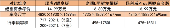 空间表现上,瑞虎9耀享版的“全能性”进一步放大优势。其车身尺寸为4820×1930×1699mm,轴距2820mm,不仅在宽度上以1930mm远超途观L两驱龙耀版的1859mm和昂科威Plus两驱白金版的1883mm,更提供5座/7座两种布局选择。5座版本后备箱容积达717-2021L,即便满载5人,仍能轻松容纳家人出行携带的行李箱+露营装备;7座版本在第三排正常使用时,也能保留200L的基础储物空间,完全满足多孩家庭的短途出行需求。相比之下,途观L两驱龙耀版后备箱容积495-1780L,空间灵活性稍逊;昂科威Plus两驱白金版后备箱容积475-1531L,无论是基础容积还是扩展能力,都与瑞虎9耀享版存在明显差距。