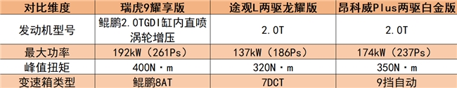 动力性能不仅关乎驾驶乐趣,更影响满载出行的安全性——超车时的动力储备、高速巡航的稳定性,都是家庭用户的核心诉求。瑞虎9耀享版搭载的鲲鹏2.0TGDI 缸内直喷 涡轮增压发动机,以192kW的最大功率、261Ps的最大马力以及400N・m的峰值扭矩,形成对合资竞品的“降维打击”:途观L两驱龙耀版搭载2.0T发动机,最大功率137kW最大马力186Ps、峰值扭矩320N・m,动力输出差距达75Ps;即便动力较强的昂科威Plus,最大马力237Ps和350N・m的扭矩,仍比瑞虎9耀享版相差甚多。