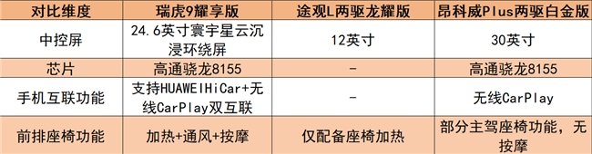 智能座舱方面,瑞虎9耀享版的24.6吋“寰宇星云沉浸环绕屏”是最大亮点,采用极智丝滑真曲面屏,在高端智慧大屏科技的加持下,带来极具沉浸感的视觉体验。虽然昂科威Plus两驱白金版的30英寸中控屏尺寸更大,但不如瑞虎9耀享版带来的沉浸式体验感。相对而言,途观L两驱龙耀版的12英寸普通屏幕便略微逊色了。