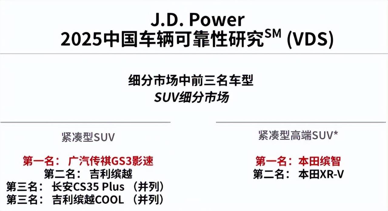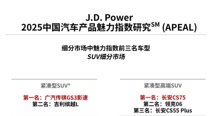 并且,在权威机构J.D.Power发布的2025年榜单中,影速也是“双喜临门”,一举拿下中国汽车产品魅力指数研究、车辆可靠性研究细分市场“双料”第一。